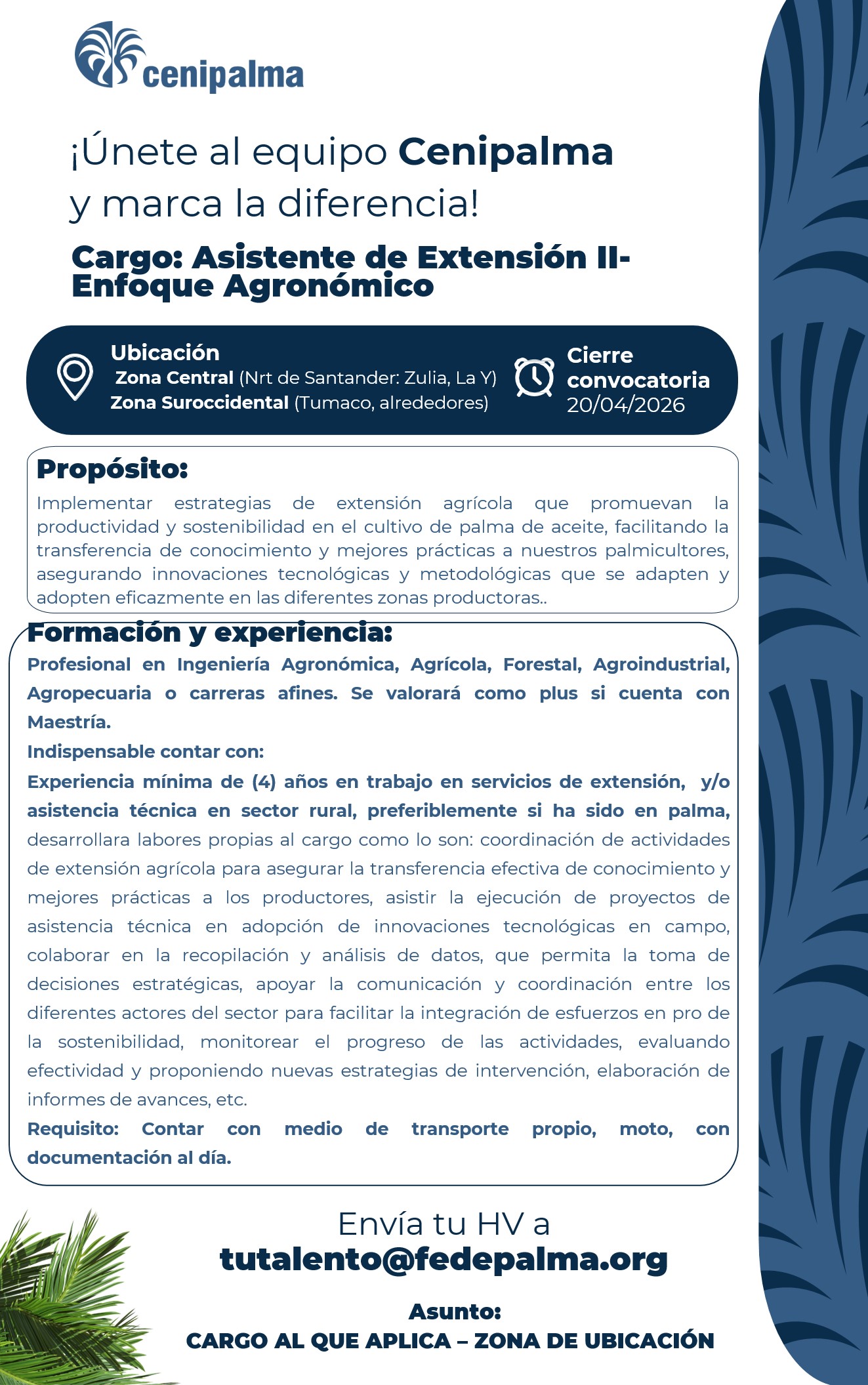 Fedepalma y Cenipalma tienen políticas y prácticas laborales que generan confianza y compromiso, posicionándonos como un Gran Lugar Para Trabajar. Contamos con talento humano calificado, ético y comprometido. Trabajamos con pasión y orgullo, valoramos las opiniones de los demás y tratamos a todos con amabilidad. Priorizamos la vida, la salud y el medio ambiente. Nos comprometemos con tecnologías amigables y reconocemos el trabajo de nuestros compañeros. Utilizamos los recursos de manera adecuada y transparente. Juntos, construimos una agroindustria única en Colombia y en el mundo.