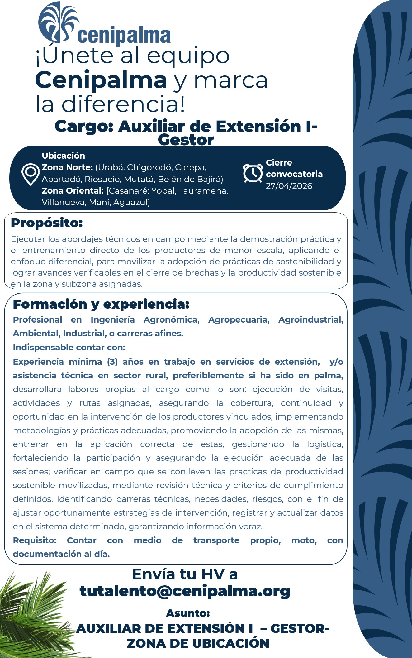 Autorizo de manera voluntaria, previa, explícita e informada a la Federación Nacional de Cultivadores de Palma de Aceite – Fedepalma, NIT 860.024.423-6, con domicilio principal en la Calle 98 No. 70-91 de Bogotá, como responsable del tratamiento de mis datos para que sean compilados, almacenados, consultados, usados, procesados y suprimidos, con fines gremiales y envío de informes de precios y mercados, en cumplimiento de la ley de datos personales, sus decretos reglamentarios, modificaciones y adiciones. En virtud de lo anterior, manifiesto expresamente que puedo ser contactado a través de correo electrónico, mensajes de texto y/o llamadas telefónicas.